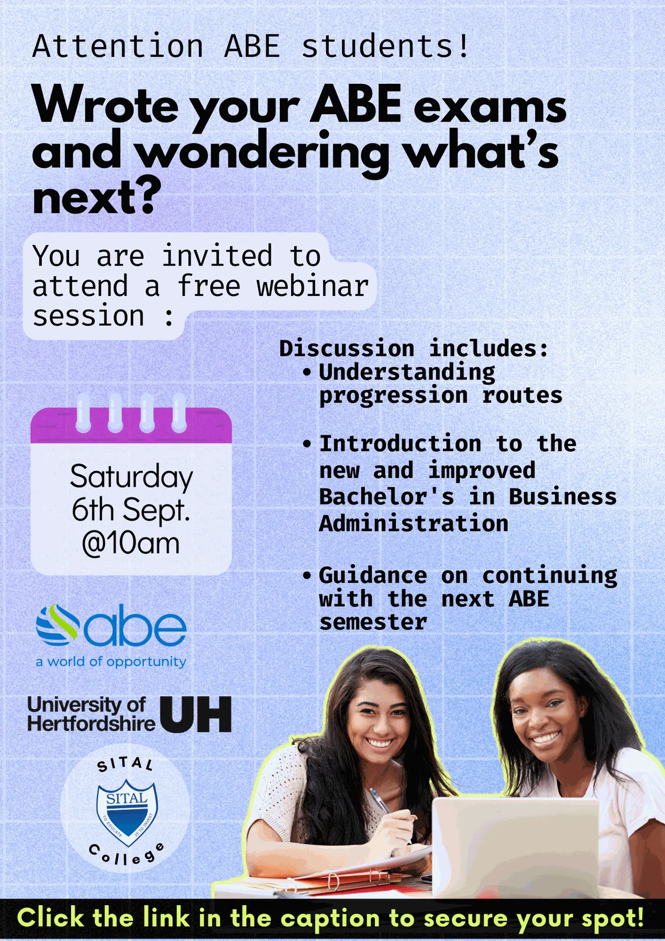 Whether you’re ready to take the leap into the Bachelors in Business Administration (Sept 2025 or Jan 2026) or planning to continue your ABE journey, this session will guide you every step of the way.